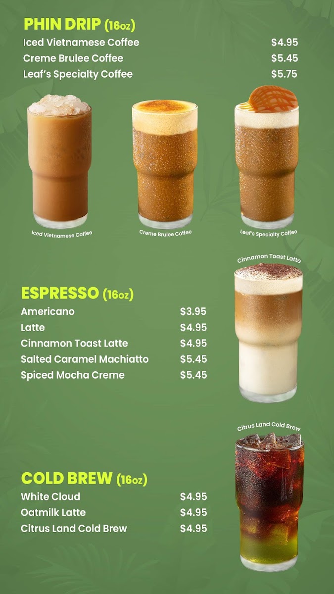 - Milk Teas: The Leaf Specialty and Roasted Coconut Milk Tea are flavorful highlights popular among patrons.